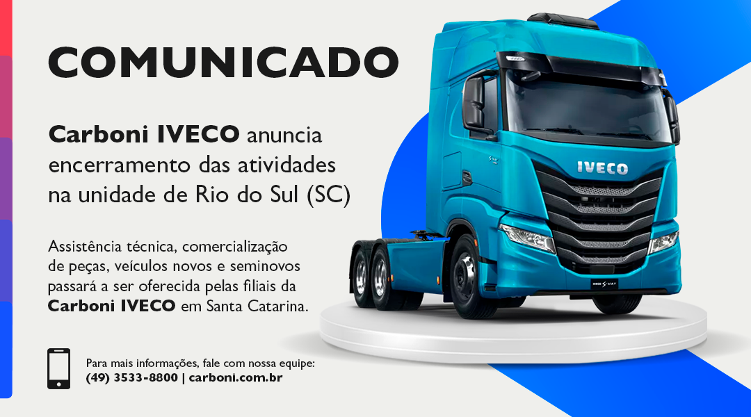 A Carboni IVECO informa o encerramento das atividades em sua unidade de Rio do Sul/SC. A partir de 20 de outubro, os atendimentos de vendas, pós-vendas, assistência técnica e comercialização de peças, veículos novos e seminovos para clientes do Alto Vale do Itajaí passam a ser realizados nas demais concessionárias Carboni IVECO em Santa Catarina.