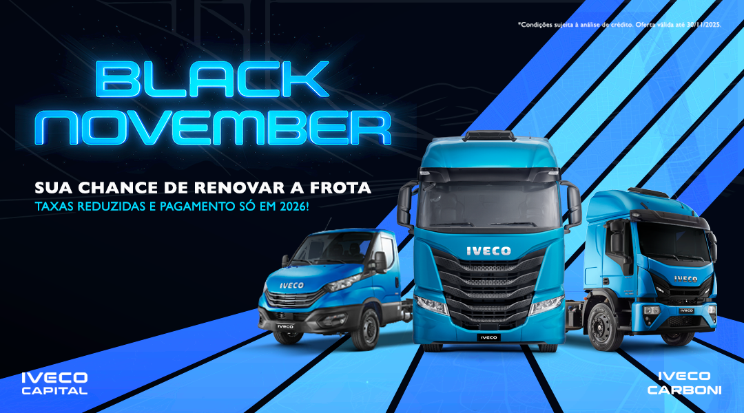 A IVECO Carboni anuncia oficialmente as condições comerciais da campanha Black November 2025, válida até 30 de novembro, com oportunidades especiais de financiamento para as linhas Daily, S-WAY, Tector e Bitruck. As melhores taxas e modalidades desta campanha são oferecidas pelo IVECO Capital, com alternativas que incluem taxa zero, entrada zero, carência estendida e pagamento apenas em 2026, todas sujeitas à análise e aprovação de crédito.